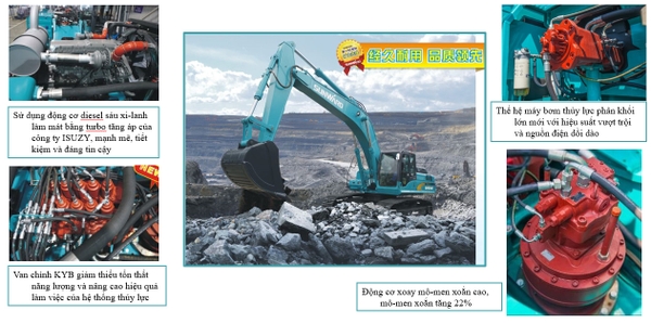 - Gầu đá mới "hyperbolic" giúp giảm độ mòn đáy gầu, giảm đáng kể lực cản khi đào, cải thiện đáng kể độ trôi chảy và giảm đáng kể mức tiêu thụ nhiên liệu tổng thể của máy;