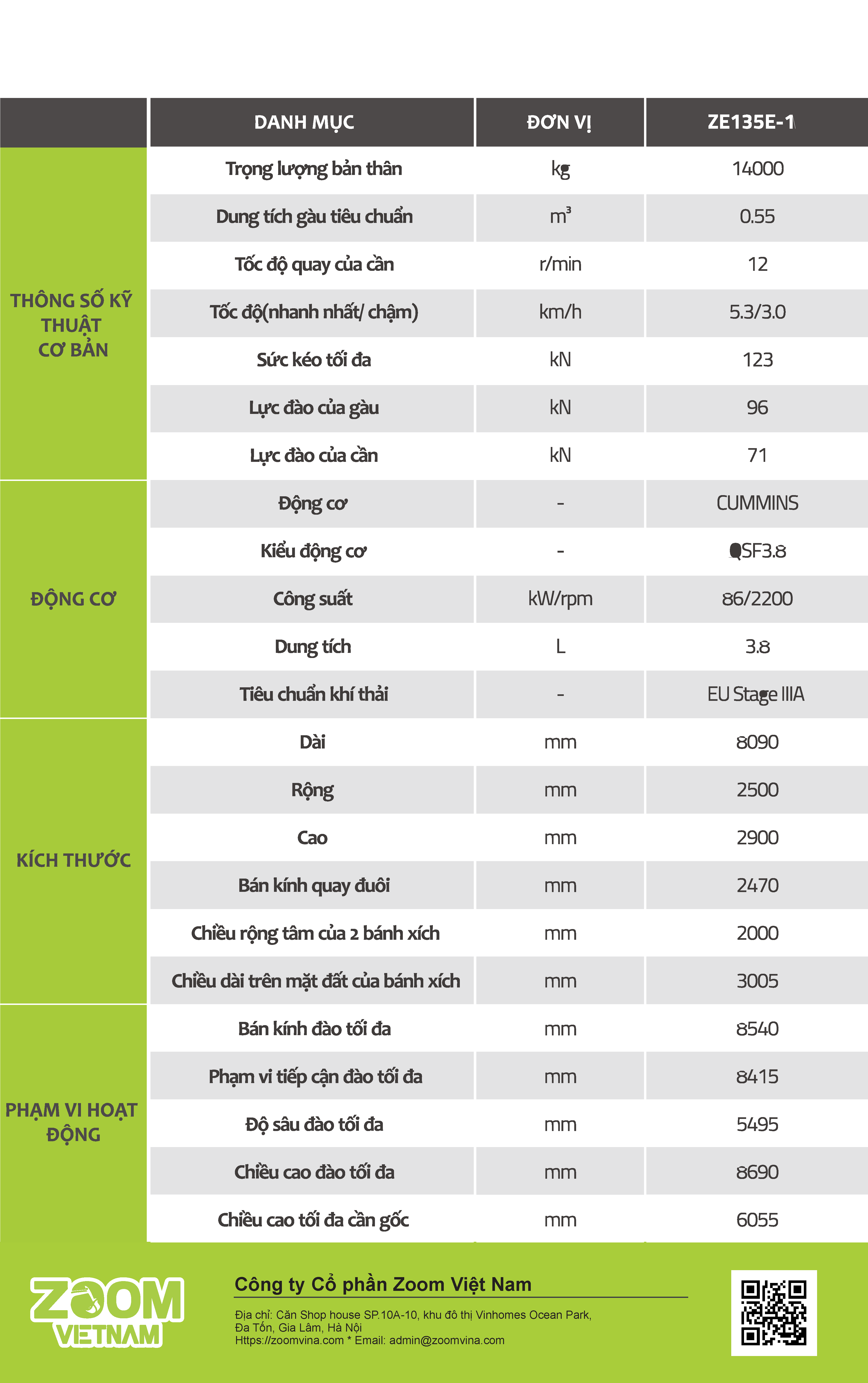 Với các thông số kỹ thuật mạnh mẽ và khả năng làm việc đa dạng, máy đào ZE135E-10 là một công cụ hiệu quả và đáng tin cậy trong các dự án xây dựng và khai thác.