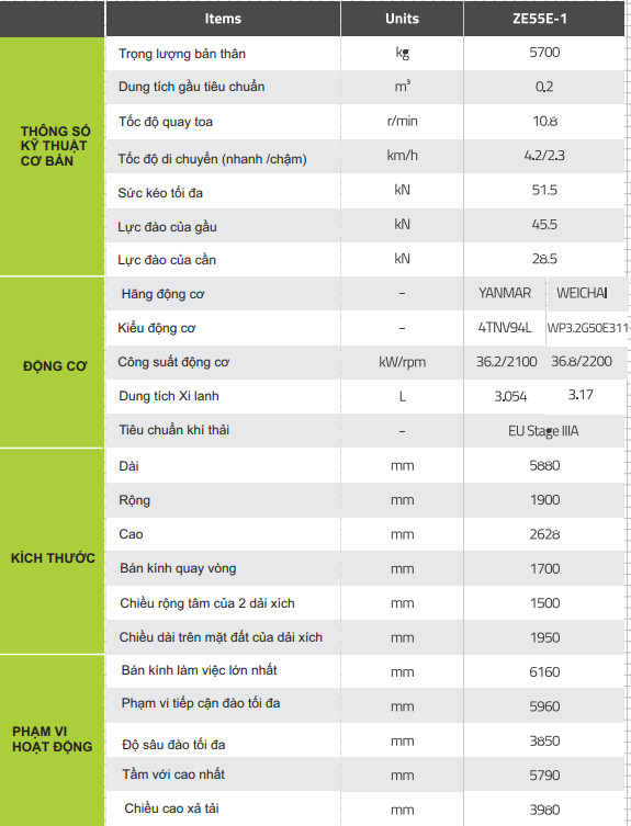 Với kích thước (dài x rộng x cao) là 5880 x 1900 x 2628 (mm) và bán kính quay vòng chỉ 1700 mm, ZE55E-10 dễ dàng di chuyển và hoạt động trong không gian hạn chế. Độ sâu đào tối đa 3850 mm và tầm với cao nhất 5790 mm cho phép bạn tiếp cận các vị trí khó khăn và làm việc hiệu quả.